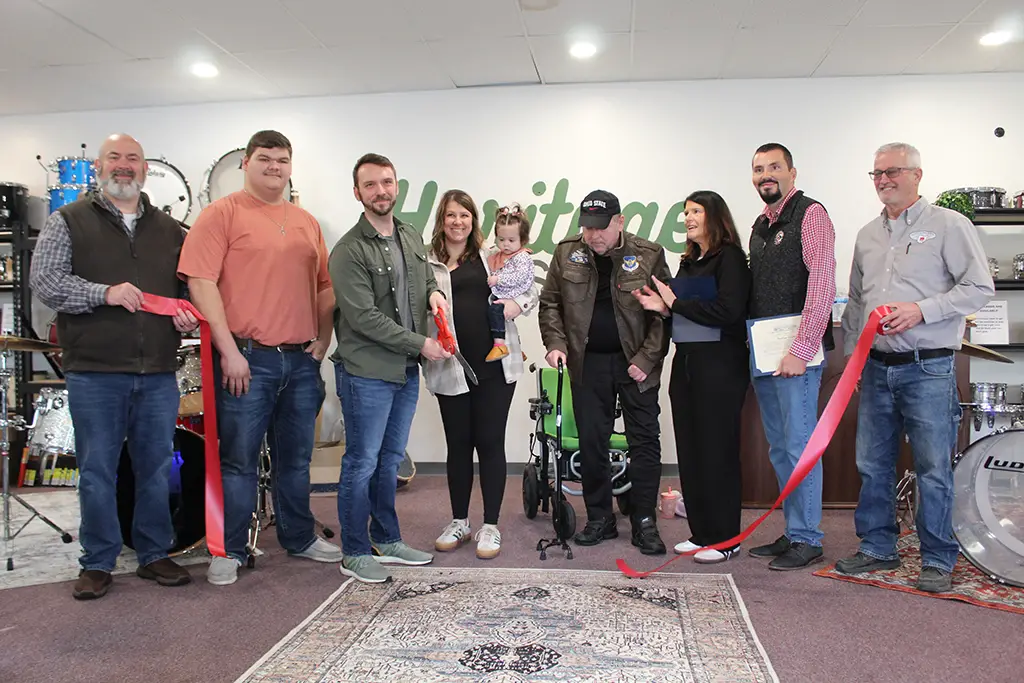 Jackson area drummers — and many more across Ohio — now have a new reason to visit 110 Twin Oaks Drive in Jackson with the recent opening of Heritage Drums! Owned and operated by Taylor Stepp — a drummer, himself — his initiative began first in Columbus from an interest in buying and reselling vintage gear and quality instruments that others were selling online. Succeeding with this venture, Stepp wished to fill the need that was available in Southern Ohio and opened Heritage Drums to serve that need. On Saturday, Nov. 22, the Jackson Area Chamber of Commerce held a ribbon-cutting ceremony to officially welcome the business to the area. Present, in addition to friends, family and supporters of Stepp, were Jackson County Economic Development Partnership President and CEO Sam Brady, Jackson Mayor Randy Evans, several board members of the Jackson Area Chamber of Commerce, Bryn Stepp from the office of Senator Jon Husted and Michael Perkins from the office of Congressman David Taylor. Bryn Stepp and Perkins both presented commendations issued by their respective offices. Taylor Stepp wished to thank both his wife, Natalie, and Shop Coordinator Daniel Adams for their unmitigated support and help in realizing this dream. “I really appreciate Jackson,” said Stepp. “I’m so happy to be a part of this community and thank you for all the support.” Pictured (from left to right) are Sam Brady, Daniel Adams, Taylor Stepp, Natalie Stepp, Ken Stepp, Bryn Stepp, Michael Perkins and Randy Evans.