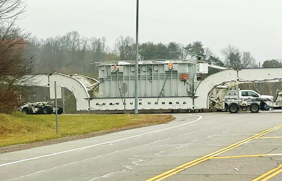 Many motorists traveling in Jackson County on U.S. Route 35 west of Jackson and on State Route 93 between Jackson and Wellston on Thursday, Nov. 20 may have noticed a specialized heavy-haul trailer carrying a “oversized load” of a much greater size than normal. The cargo is a large transformer. The oversized-load unit has a permit from the Ohio Department of Transportation (ODOT) to transport this load to its destination. An ODOT spokesman later told The Telegram that the unit is 311 feet long, 16 feet and 6 inches wide, and 16 feet tall. The full rig and load weigh 907,208 pounds. The Telegram began receiving messages at approximately 11:30 a.m. about the oversized-load unit as it was turning off the exit ramp from U.S. Route 35 onto State Route 93 toward Coalton. Prior to its arrival by truck and trailer in Jackson County, the load was spotted on a railroad car arriving in Richmon Dale in nearby Ross County. The final destination is the Rolling Hills Generating Plant, which is located just west of Wilkesville on State Route 160 in Vinton County. The oversized-load unit took a number of hours to traverse from eight miles from the U.S. Route 35/State Route 93 overpass into Wellston and resulted in some traffic delays on State Route 93.. Reportedly, the unit took around an hour to travel through Coalton. A stop sign had to be removed at the intersection of Main Street and Broadway Street for the rig to be able to make the turn toward Wellston. Other obstacles along the way, including utility lines tree limbs, also held up travel. The unit was parked for the night at the Montgomery Trucking Co., located along E. 13th Street in Wellston, and will likely not resume its trip until at least Sunday. The hauler is reportedly waiting to hear about permits and has other tasks to complete before continuing. The anticipated route to the Rolling Hills Plant will be State Route 32, east to State Route 160, then south on State Route 160 to the Rolling Hills Plant. The unit is likely an “over dimensional” permitted vehicle/load, which means it is over-length on width or height and it may only travel during daylight hours, which are defined as 1/2 hour before sunrise and 1/2 hour after sunset.